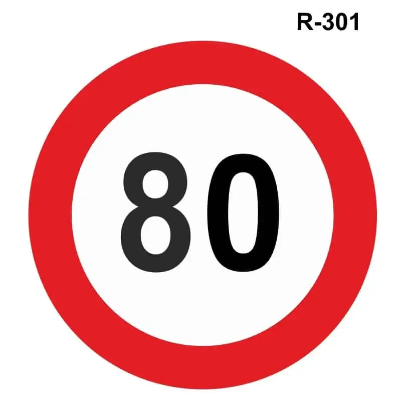 Esta señal nos indica la prohibición de circular a una velocidad superior de 80 km/h. Obliga desde el lugar en que esté situada hasta la próxima señal de «Fin de la limitación de velocidad», de «Fin de prohibiciones» u otra de «velocidad máxima», salvo que esté colocada en el mismo poste que una señal de advertencia de peligro o en el mismo panel que ésta, en cuyo caso la prohibición finaliza cuando termine el peligro señalado.