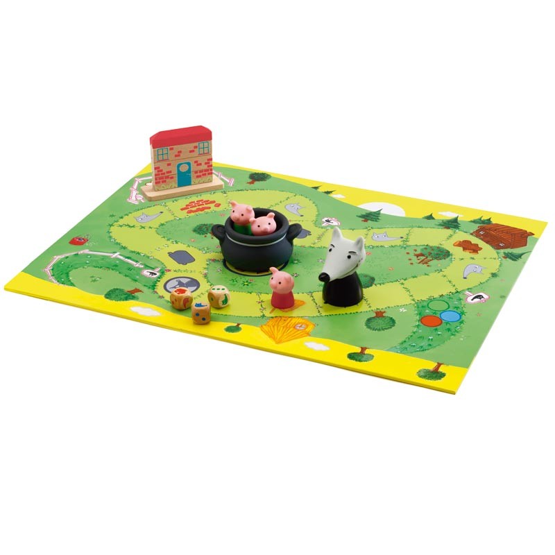 Contenido: 1 tablero, 3 peones “cerditos”, 1 peón lobo, 1 olla, 3 dados de los mismos colores que los cerditos (caras 1, 2, 3, dos caras “lobo”, una cara “casa”), 1 “casa de ladrillo” en 4 partes, instrucciones.