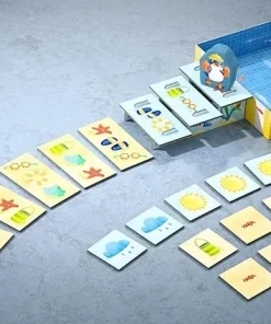 • Contenido: 1 pingüino Piwi, 1 escalera (de 5 piezas), 1 piscina (base de la caja), 6 fichas de ruta, 6 fichas memo, 6 fichas con soles, 1 instrucciones del juego