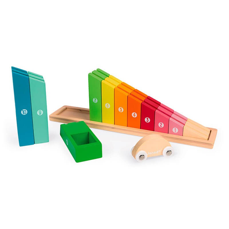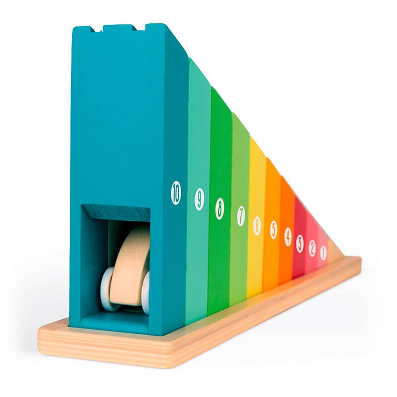 Ordenándolos de forma creciente en el zócalo, los pequeños podrán crear una rampa arcoíris para después lanzar el coche y comprobar que no ha habido ningún error.