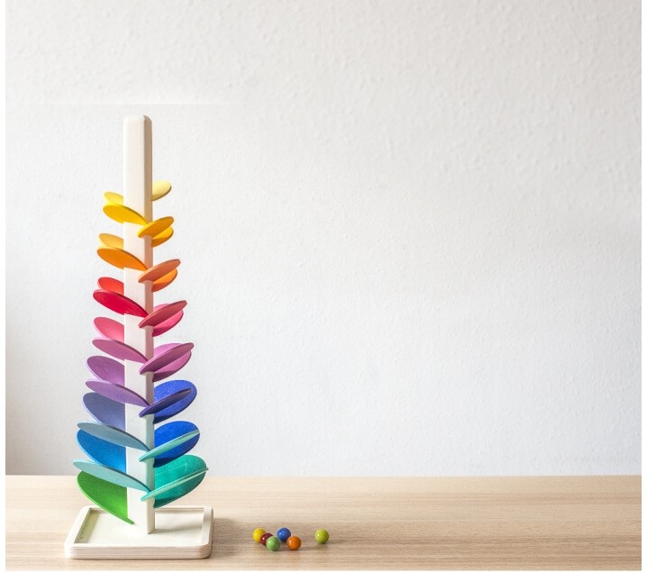 La bola irá cayendo y resonando al golpear cada lengüeta de color, los niños toman conciencia de un elemento fundamental en su desarrollo: el ritmo.