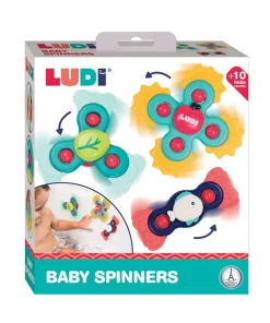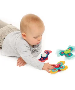 Juego de 3 spinners para bebés. Se adhieren a cualquier superficie lisa con su ventosa.  Fabricados en plástico suave y flexible y fáciles de iniciar y detener. Perfectos para desarrollar habilidades motoras fina y gruesa, causa-efecto, coordinación óculo manual, la agudeza visual…