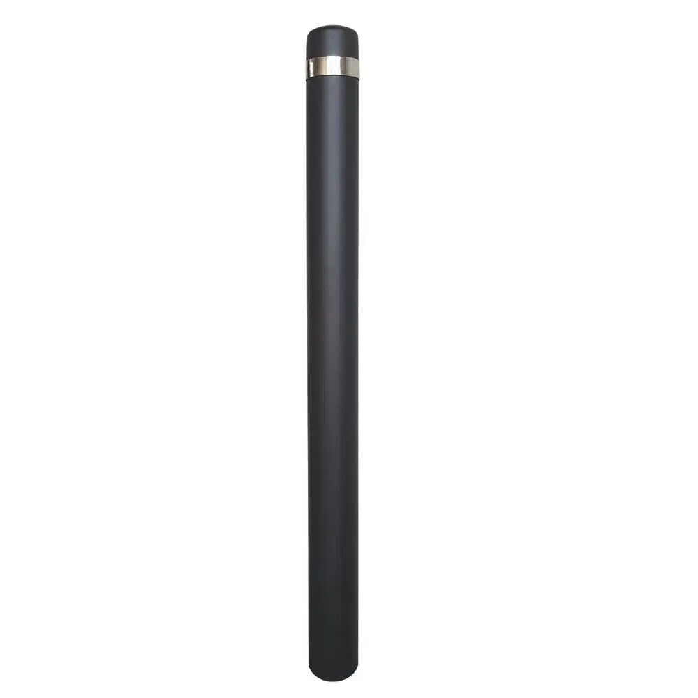 Este bolardo fijo de protección lacado en color negro y preparado para instalarse en el suelo tiene el distintivo de tener una franja de acero inoxidable que le da un toque más elegante.