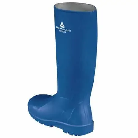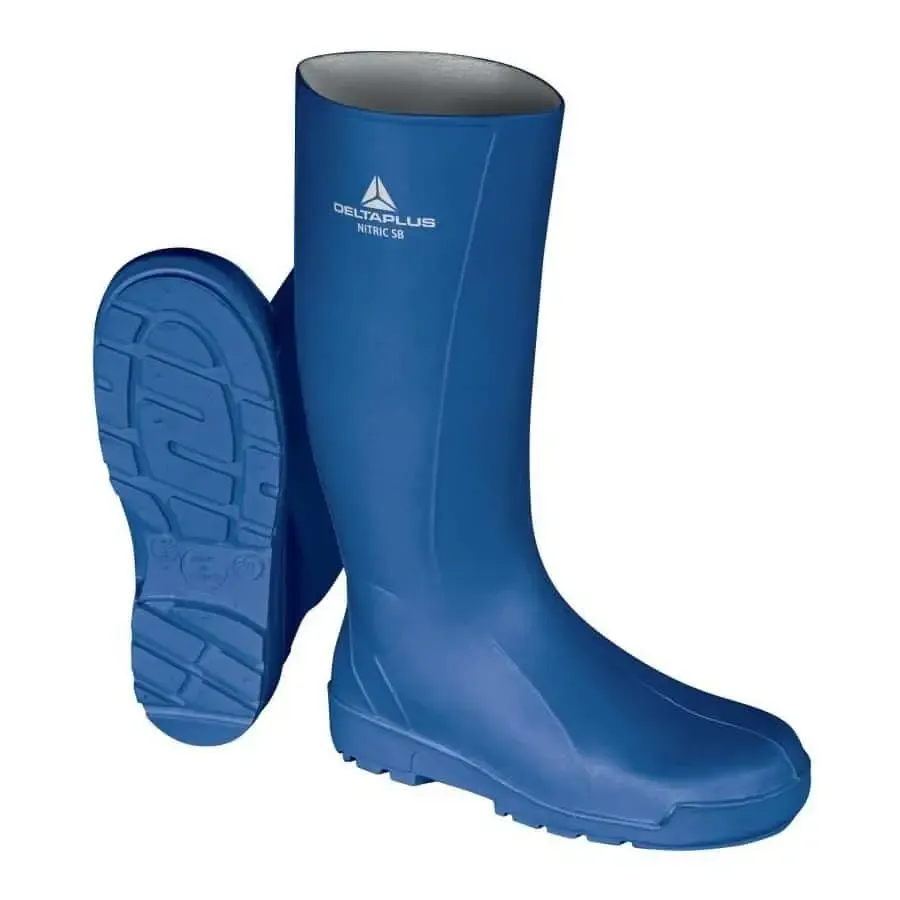 Botas de agua azules con suela nitrilo modelo Nitric SBFO de Delta Plus con propiedades antideslizantes y fabricadas en caña alta de pvc, pensadas para trabajos en salas blancas y sector de la agroalimenación. Estas botas tienen las mismas características que las botas de agua blancas Nitric pero en color azul.