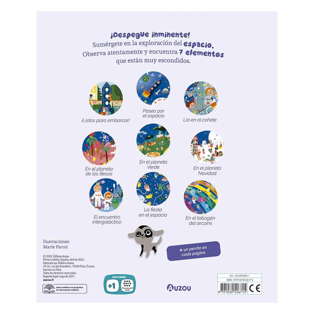 ¡Despegue inminente! Sumérgete en la exploración del espacio. Observa atentamente y encuentra 7 elementos que están muy escondidos en cada página. ¿Serás capaz de encontrar al perrito que se esconde en cada página? Una colección de Busca y Encuentra para los más pequeños con ilustraciones repletas de detalles. ¡Ideal para desarrollar el sentido de la observación en los más pequeños!