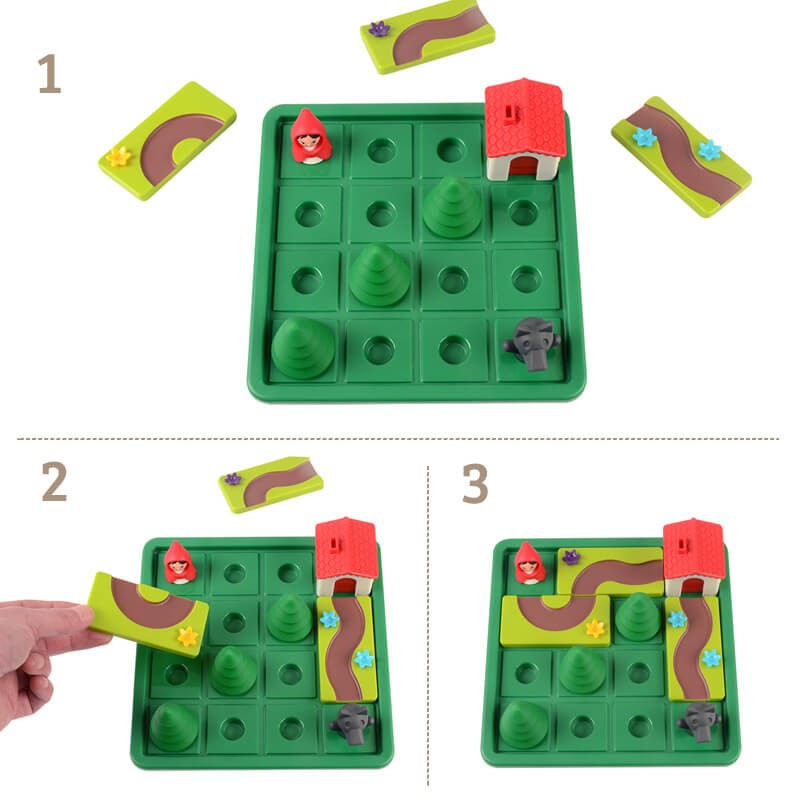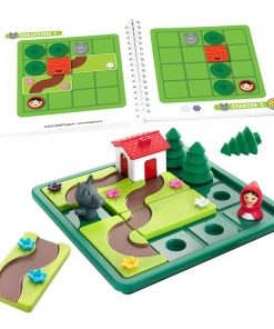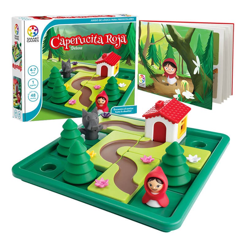Contenido: 5 piezas de caminos con flores. 1 Caperucita y 1 lobo. 3 árboles y 1 casa. Cuento con imágenes. Cuaderno de 48 retos con soluciones, Instrucciones.