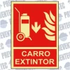 Señal de seguridad de socorro que nos indica la dirección ( hacia la izquierda ) de la existencia de un carro con extintor para ser utilizado en situación de incendio.