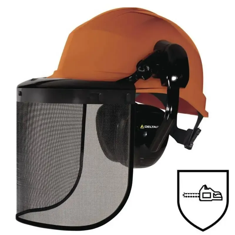El casco forestal Delta Plus modelo Forestier 3 es un equipo de protección completo, diseñado para brindar una seguridad integral en trabajos forestales. Este sistema incluye un casco de seguridad, un visor de rejilla metálica y auriculares de protección auditiva.