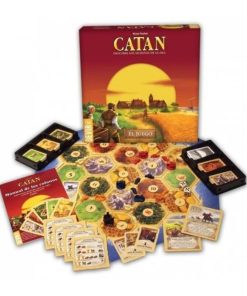 Contenido: 19 hexágonos de terreno, 95 cartas de materia prima, 25 cartas de desarrollo, 4 tablas de costes de construcción, 2 cartas especiales, 2 porta cartas, 16 figuras de ciudades, 20 figuras de poblados, 60 figuras de carreteras, figura de ladrón gris, 18 fichas numeradas, 2 dados, Instrucciones.