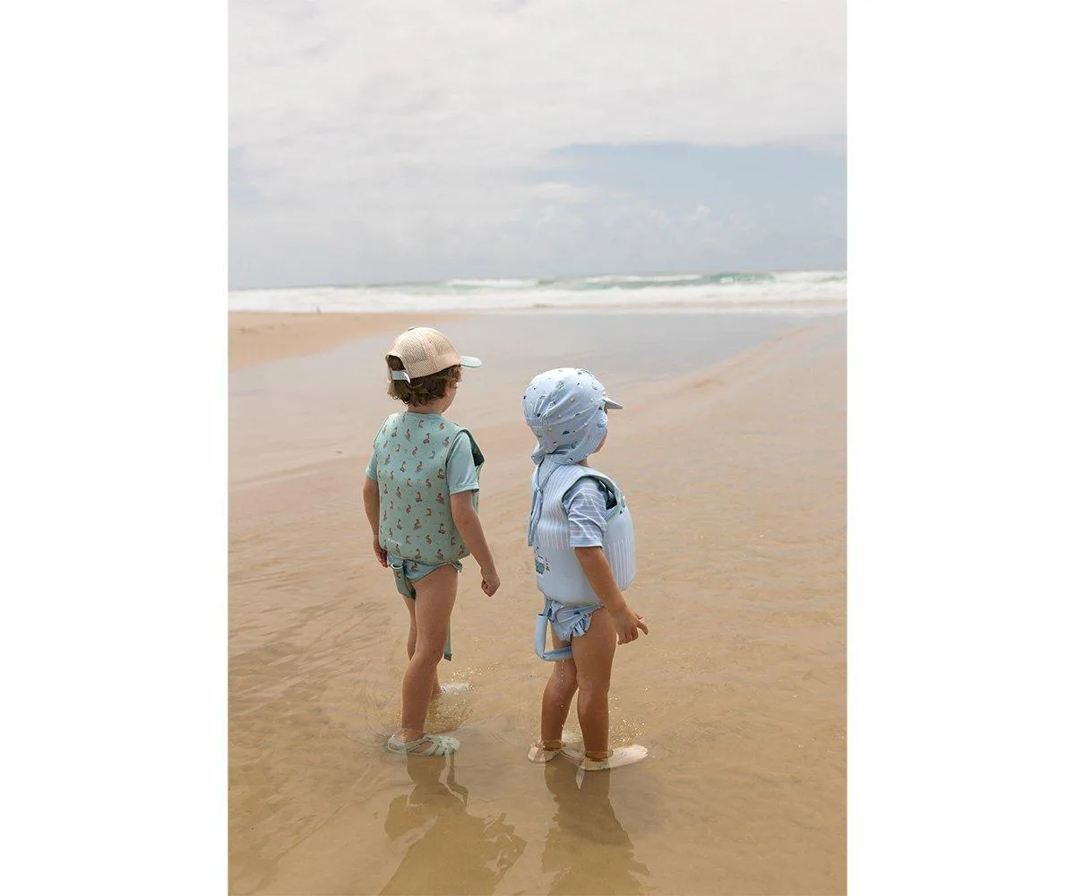 Descubre el adorable chaleco flotador de la colección Fishing Boat que cuenta con una cinta con cierre de seguridad para colocar entre las piernas con el fin de que el chaleco no se salga por la cabeza, en caso de tirarse al agua de manera vertical o cuando, simplemente, está flotando en el agua.Además está protegida con neopreno para evitar rozaduras entre las piernas.
