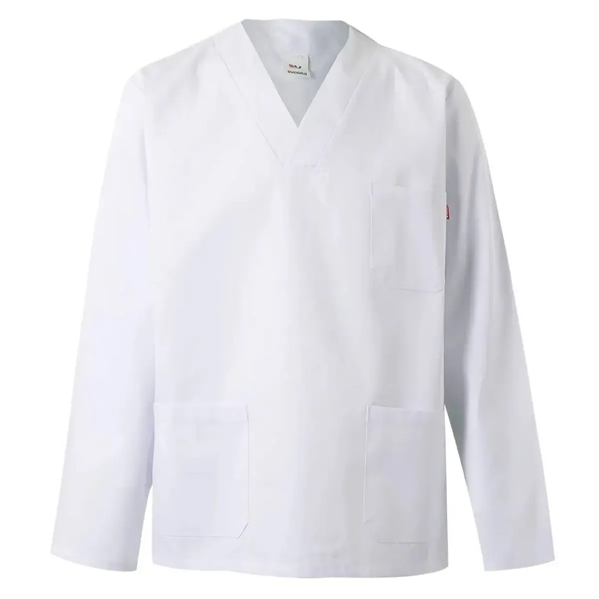Chaqueta pijama blanco sanitario modelo 588 de Velilla para personas que trabajen en el sector sanitario, limpieza o comercios y hacen un conjunto pijama junto con los pantalones sanitarios 334.