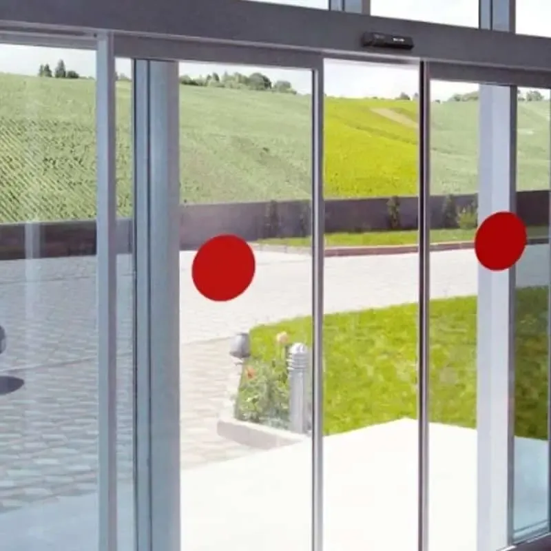 Estos círculos están fabricados en vinilo adhesivo. Los adhesivos se colocan en la parte exterior del cristal para mejorar su visibilidad y a una altura que sea fácilmente visible para las personas.