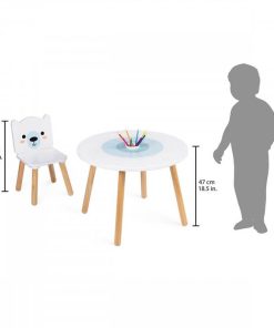 Un bonito conjunto de mesa y dos sillas de madera de colores polares.