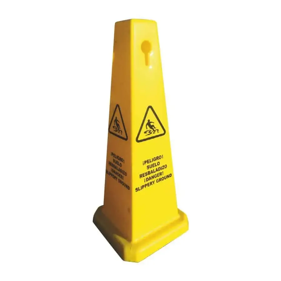 La ventaja de esta señal peligro suelo mojado en un cono de señalización es que al haber 4 caras es visible desde cualquier punto.