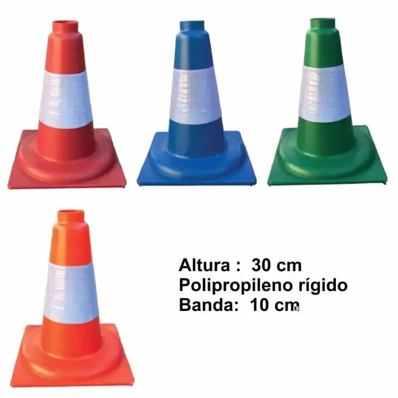 Conos de plástico deportivos de señalización con una reducida dimensión, 30 cm de altura, económicos, con banda reflectante de 10 cm y homologados.