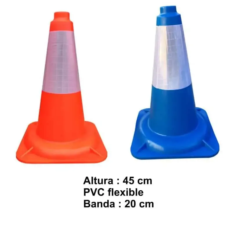 Conos señalización de 45 cm fabricados en material pvc flexible para no dañar a los vehículos que impactan con ellos.