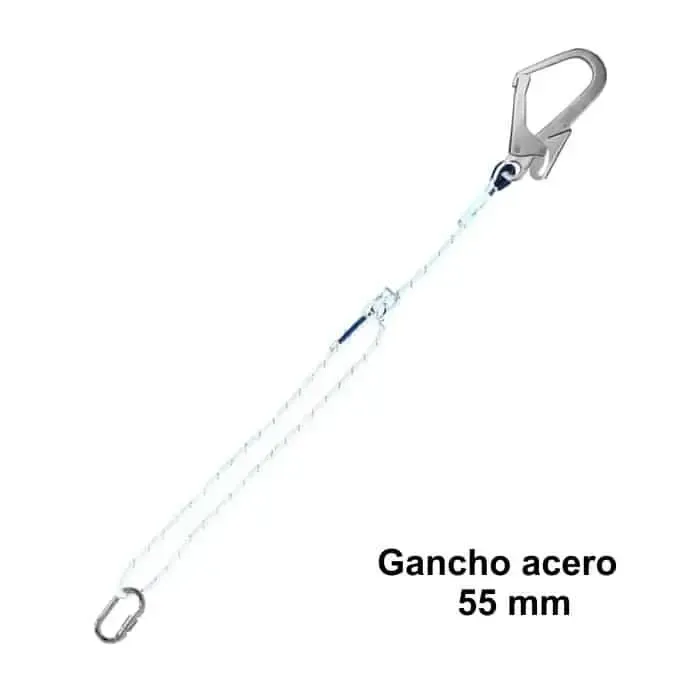 - Terminaciones con un guardacabo, un mosquetón de 17 mm con cierre rosca y un gancho de acero de 55 mm apertura para anclaje.