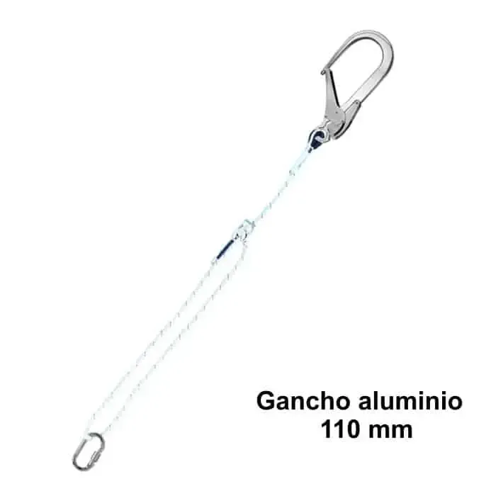 - Terminaciones con un guardacabo, un mosquetón de 17 mm con cierre rosca y un gancho de aluminio de 110 mm apertura para anclaje.