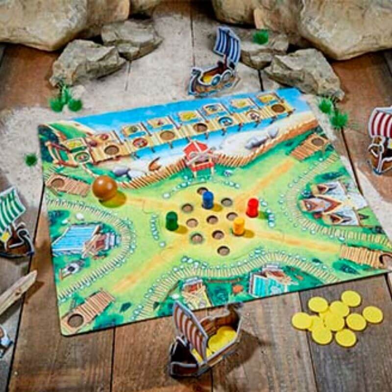 Cada jugador coge un barco, coloca las fichas de vikingos delante de la primera casilla del embarcadero y los toneles en los agujeros.