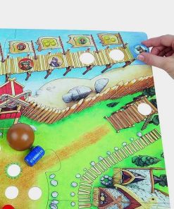 Coge la bola y el empujabolas y, desde la rampa, tumba los 4 toneles; por cada tonel tumbado, la ficha de vikingo del color correspondiente se mueve una casilla en el orden deseado hacia delante.