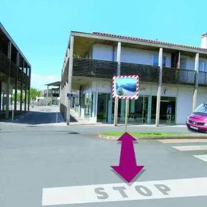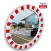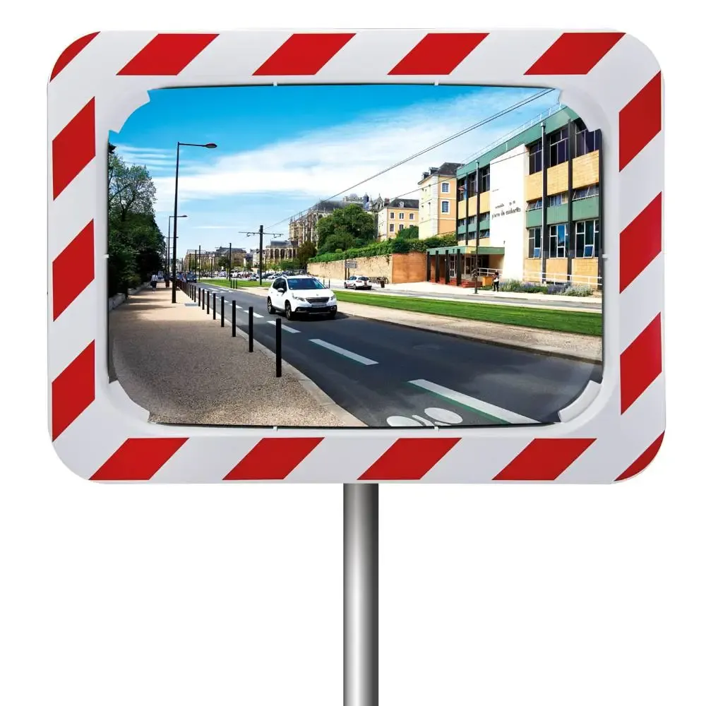 Espejos de tráfico rectangulares para exteriores fabricados con materiales de calidad y cuya principal característica es que su marco está diseñado con componentes retroreflectantes en blanco y rojo que reflejan con la luz de los vehículos y mejoran la visibilidad durante momentos de escasa luz ambiental.