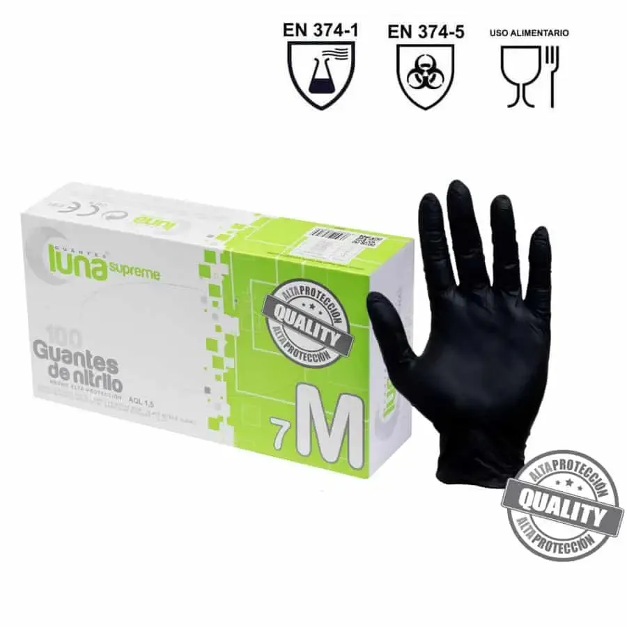 Guantes de nitrilo sin polvo de la marca Luna y color negro en caja de 100 uds.