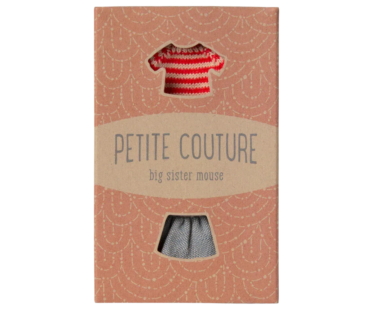 Si necesitas un nuevo conjunto de ropa para tu ratoncito, éste es una elección realmente clásica. El suave jersey de punto con rayas rojas viene con una falda.