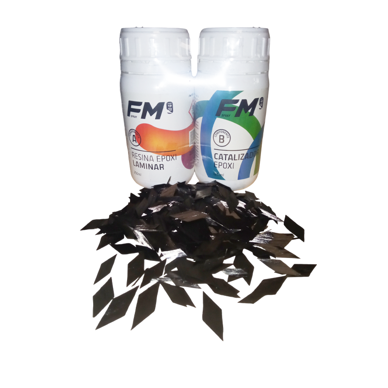 El Kit contiene: 375Mls de Resina Epoxy con catalizador + 50grs de Fibra de Carbono en forma de Diamante