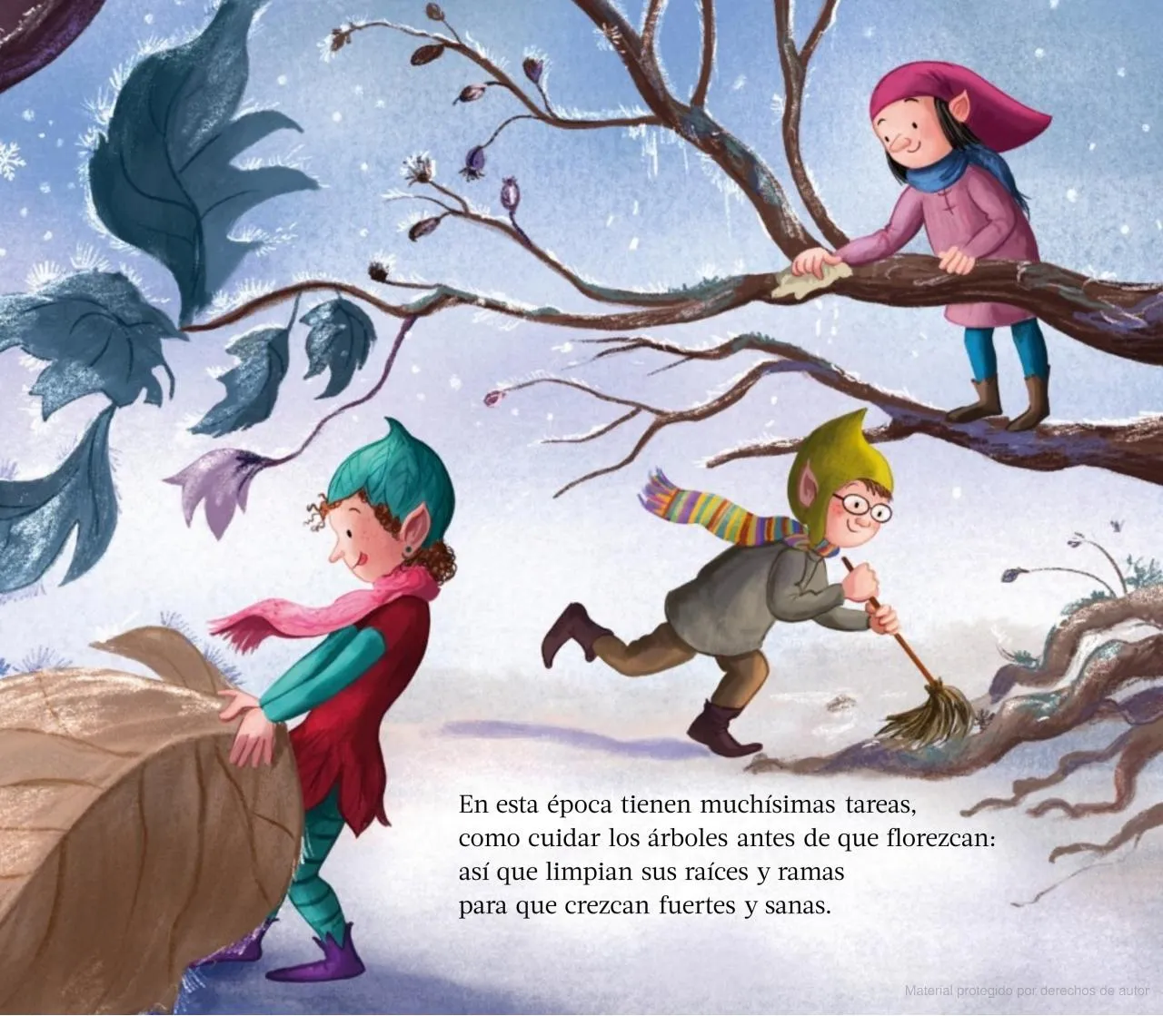 En un árbol al lado del camino habitan cinco duendecitos. Con la llegada de las estaciones, viven nuevas experiencias y emociones. Haga sol, viento o frío, buscan gotas de rocío, disfrutan de los olores, recogen frutos y cuidan de las flores…