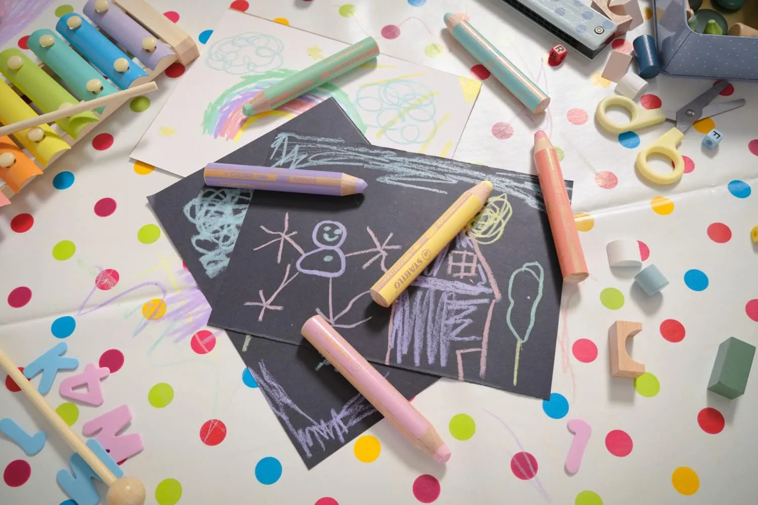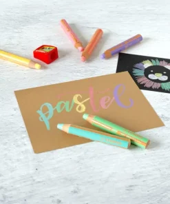 Lápices de colores pastel vibrantes y opacos, ¡incluso en papeles oscuros!, que también funcionan como ceras y acuarelas y para pintar sobre cristal. Con una mina anti-rotura XXL para dibujar y pintar desde pequeños, tan gruesa como la de 8 lápices normales: ¡10mm de diámetro!