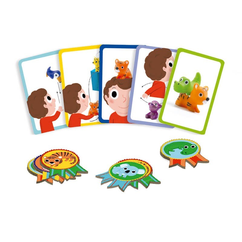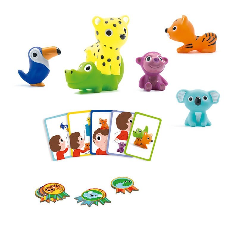 Por turnos, cada jugador cogerá una carta y deberá realizar la acción correspondiente: construir una torre con 3 animales, colocarse un animal encima de la cabeza sin que se caiga, hacer canasta, lanzar un animal y atraparlo al vuelo…