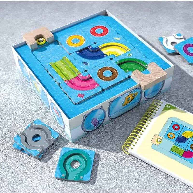 Se trata de colocar determinadas piezas como indique el reto para después deslizarlas de forma que la bola pueda circular por el circuito.