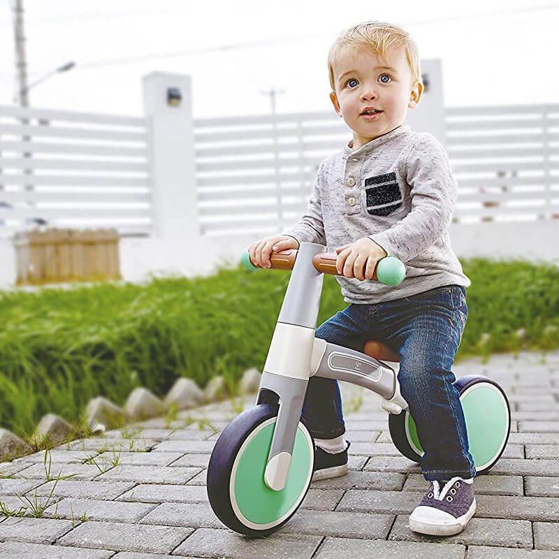 Un primer triciclo, ligero para su fácil manipulación y con asiento ajustable, en un color verde menta.