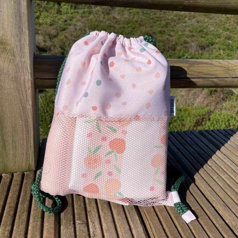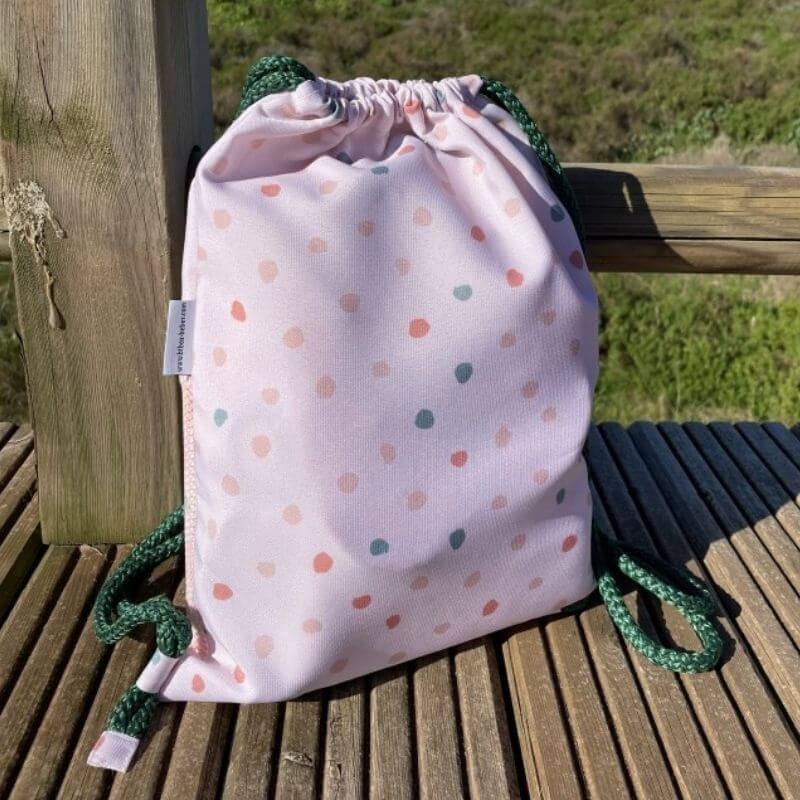 Un saco mochila de lunares rosa ideal para poder llevar a la playa con todos tus accesorios.