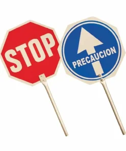 La paleta Stop-Paso para obras fabricadas completamente en aluminio están impresas en sus dos caras; una con la señal de Stop y otra con la señal de paso obligatorio.