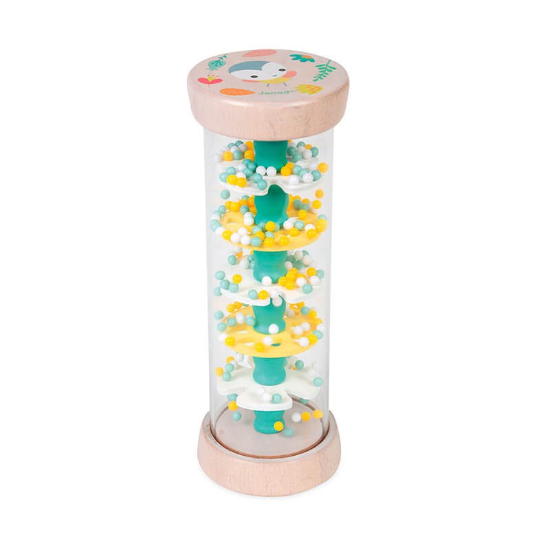Si gira el palo, las bolitas de colores bajan y producen un sonido similar a la lluvia.