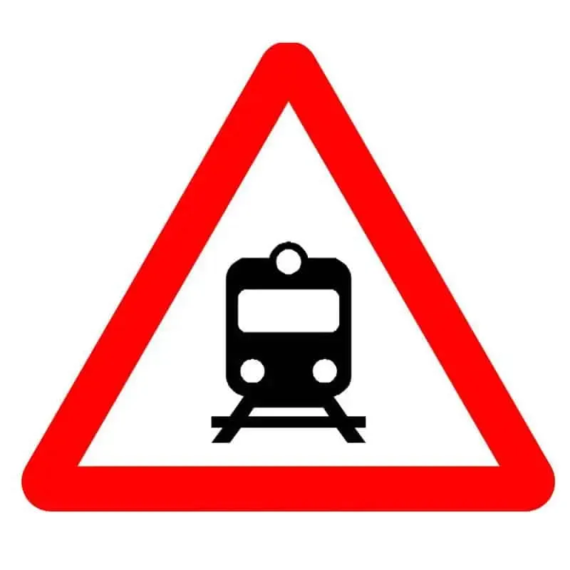 Señal de advertencia de peligro ante la proximidad de un paso a nivel sin barreras.