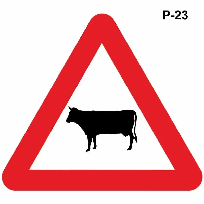 Señales de tráfico de paso de animales domésticos P-23 homologadas MOPU y señales económicas de advertencia de peligro.