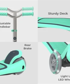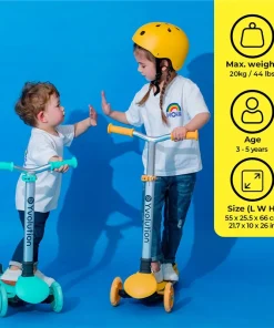 El Y Glider Air viene con una resistente plataforma de dos colores y ruedas LED que parpadean mientras conduces, ¡no requiere pilas! El patinete está fabricado con materiales ligeros que facilitan su transporte por parte del o de la peque.