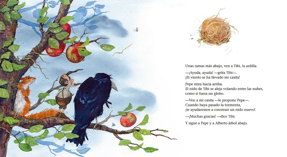En su casita, Pepe Pom estará bien protegido del mal tiempo. Pero, antes de que empiece a llover, decide ir a avisar a su amigo Alberto, un viejo cuervo que vive en las ramas más altas del manzano.