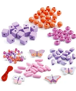 Set de 450 piezas con perlas y piezas de inspiración Mariposas, para ensartar con los cordones siguiendo los agujeros, de Djeco.