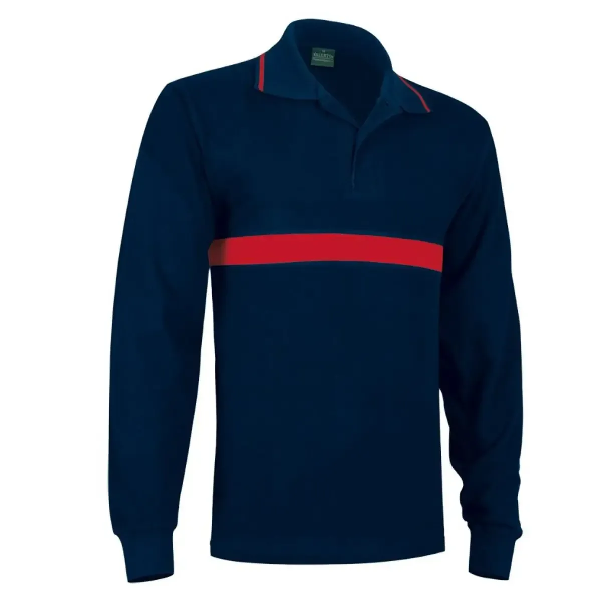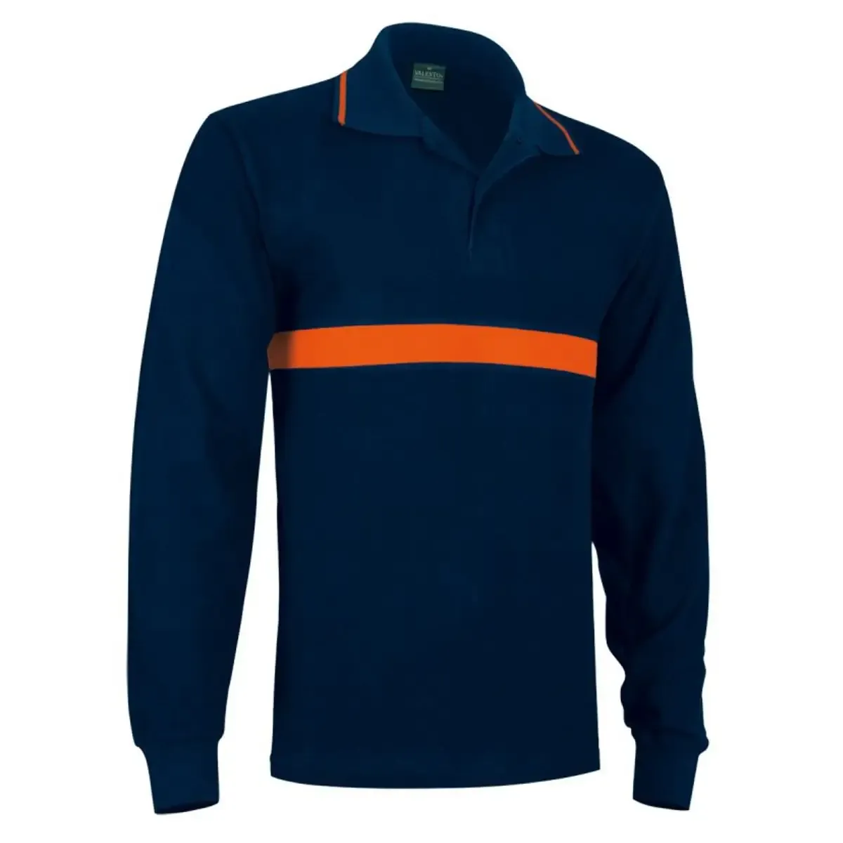 Polo manga larga modelo Server de Valento con puño en eslástico canalé y con un diseño con una franja horizontal de color naranja o rojo al estilo los uniformes de Protección Civil.