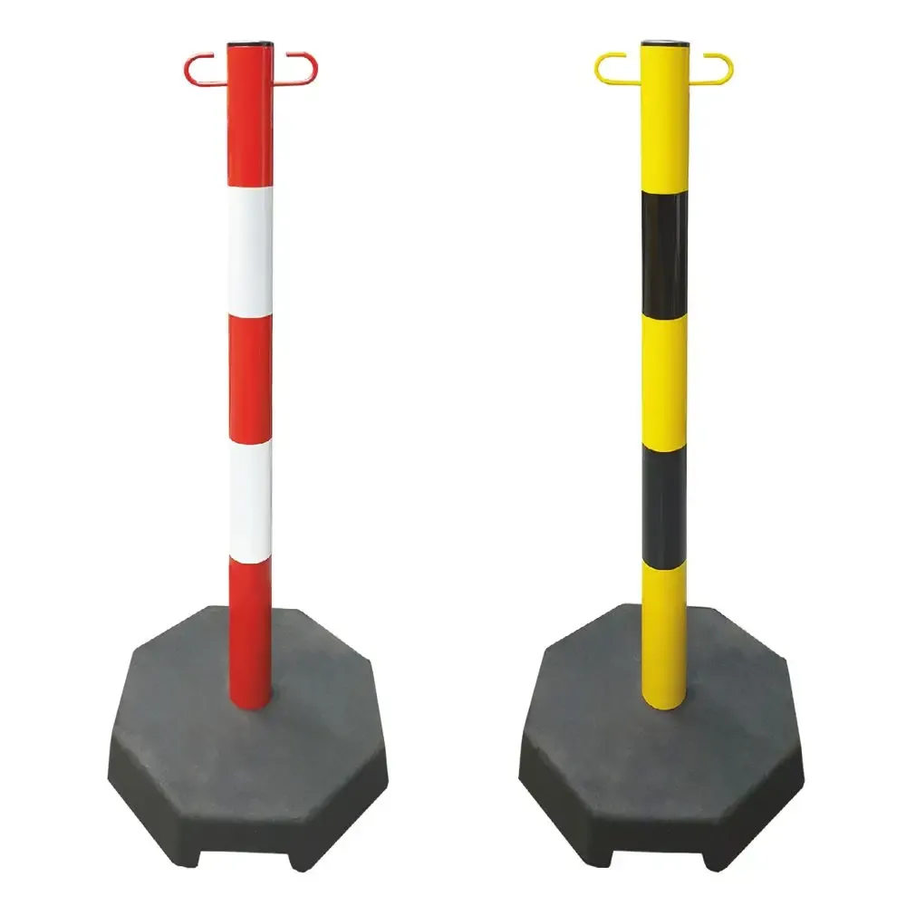 Poste señalización con base caucho hexagonal para darles mayor estabilidad y poste fabricado en acero lacado de tubo de 60 mm diámetro.