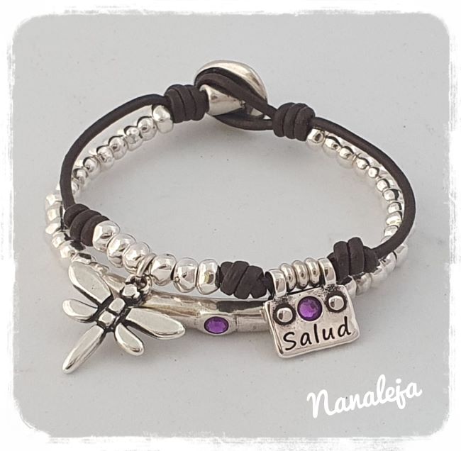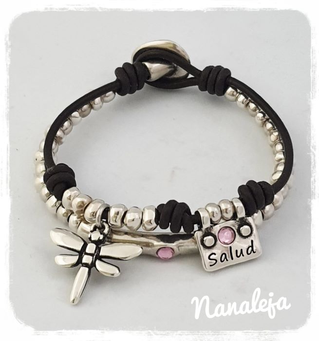 Pulsera de doble cuero con plaquita Salud cristal rosa y libélula. Hecha a mano con bolas irregulares de zamak con baño de plata, tubo con cristal del mismo color y cierre botón.