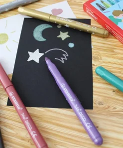 - Incluso los adultos disfrutan diseñando áreas más grandes en manualidades con su práctico ancho de punta y brillo metálico.