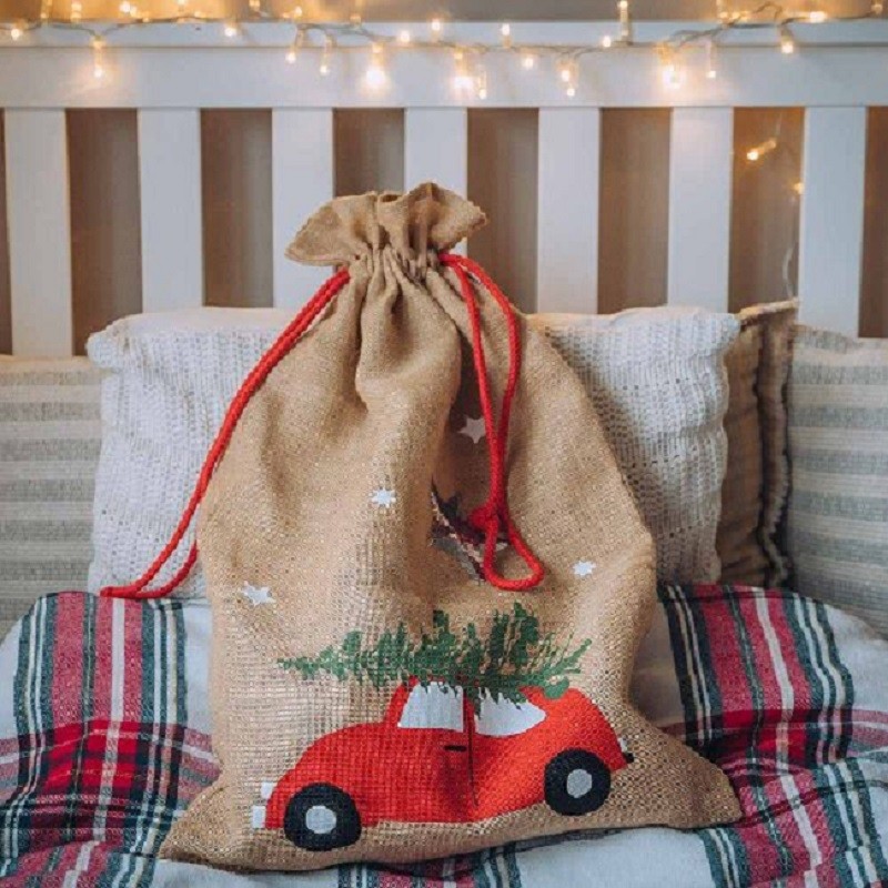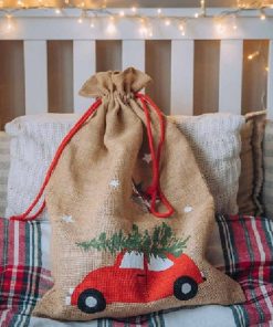 Fabricado en tela de saco y adornado con un bonito dibujo de un coche cargando un árbol navideño con un cielo estrellado.