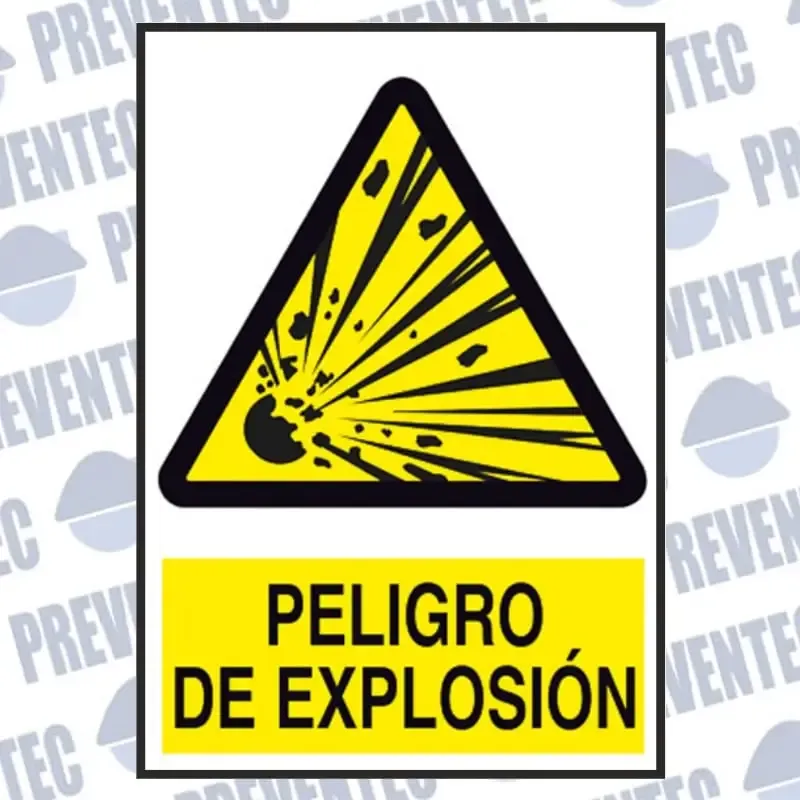 Señal advertencia de seguridad advirtiendo que las personas están en una zona con riesgo a explosión y deben tomar las precauciones pertinentes.