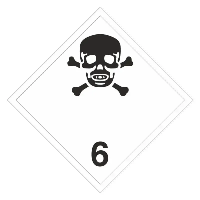 Etiqueta 6.1 ADR de materias tóxicas con dos tamaños diferentes y varios materiales como vinilo adhesivo, poliestireno o aluminio con el objetivo de informar a las personas del tipo de mercancía peligrosa que se está transportando.