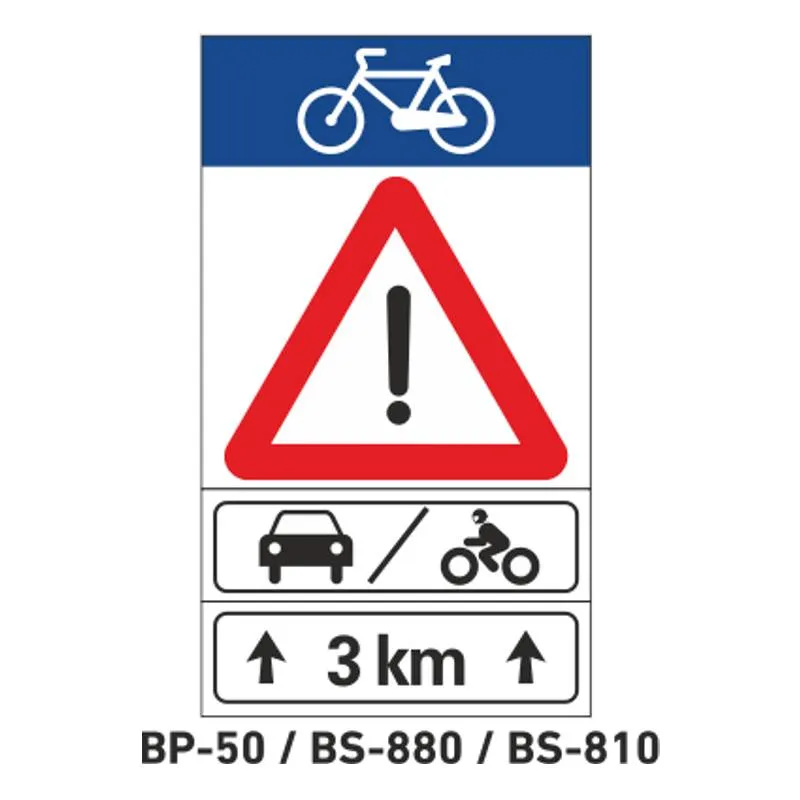 - Diseño de cuatro señales combinadas, por un lado la señal S-33 ( senda ciclista ), por otro la señal de otros peligros P-50, por otro una complementaria de aplicación para vehículos de motor y ciclos, y finalmente los kilómetros de duración de este tramo.
