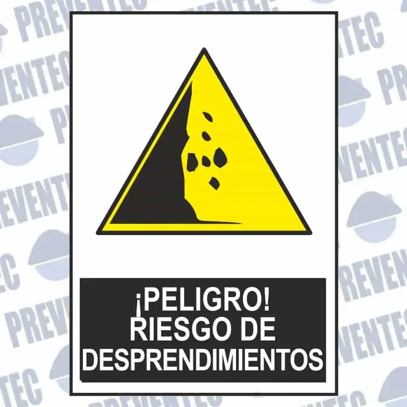 Señal peligro por desprendimientos en material PVC, vinilo adhesivo o aluminio. Gran variedad de tamaños disponibles y opciones como pictograma troquelado o sin texto.